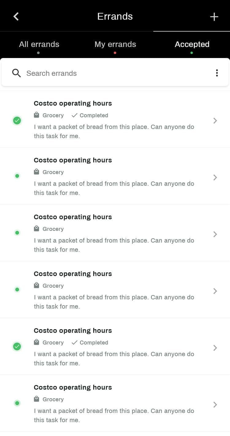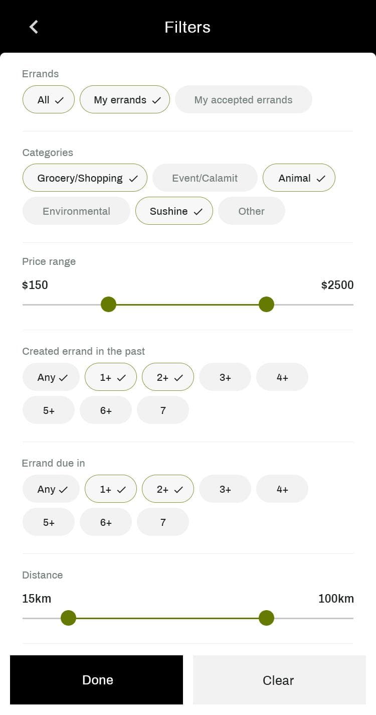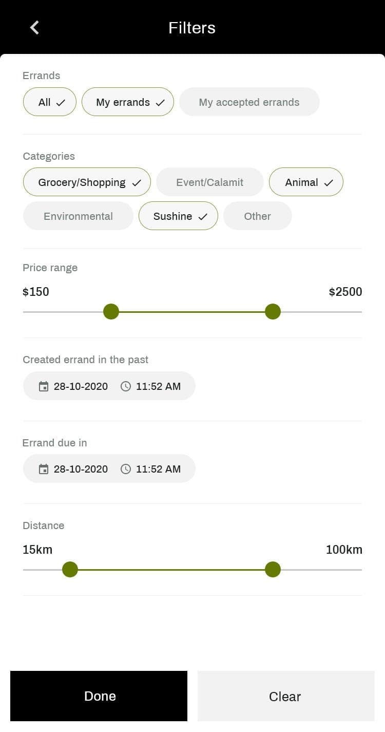 User can apply filter like category, distance, price range, date, to satisfy their criteria for filtering the errand and choose best match possible errand to accept.